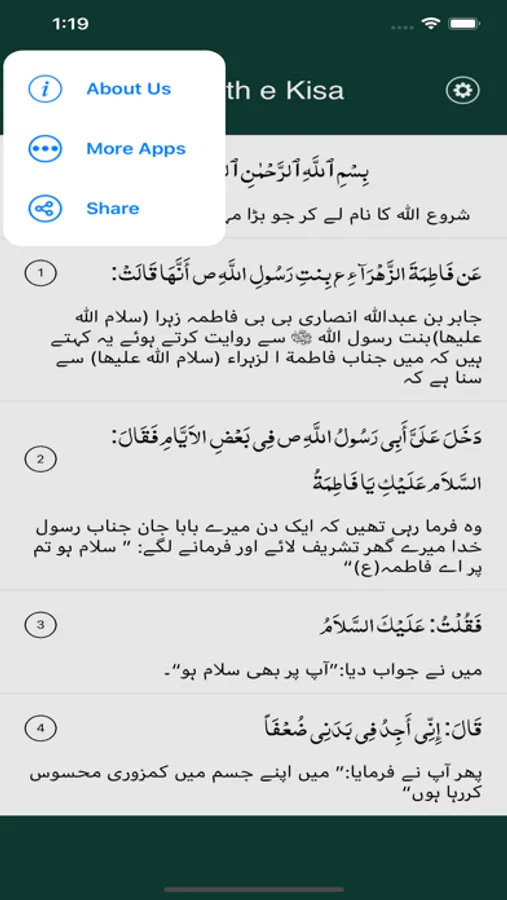 حَدِيثُ اَلكِسَاء Prophet Muhammad peace be upon him said. whenever and wherever an assembly of our followers and friends mention this event Allah will bestow on them His Blessings and Mercy angles will encircle them asking Allah the remission of their sins until the assembly disperse . Recitation of Hadise Kissa gives fulfilment of all wishes of world and (Akherat) Eternal World (here after).Hadees e kisa has been completely translated into English and also Urdu. With Audio playback each Arabic text and English text will easily appear. And also English and Urdu text is given for every Hades e kisa Arabic text.