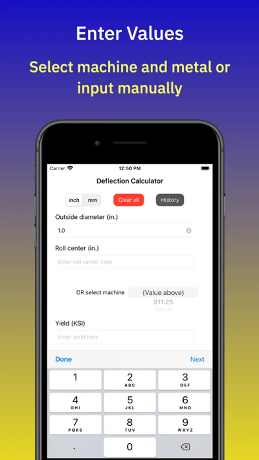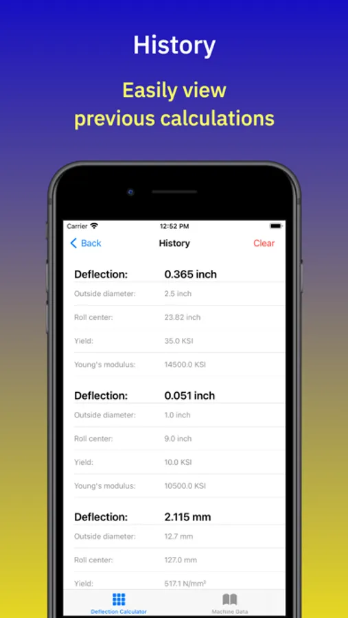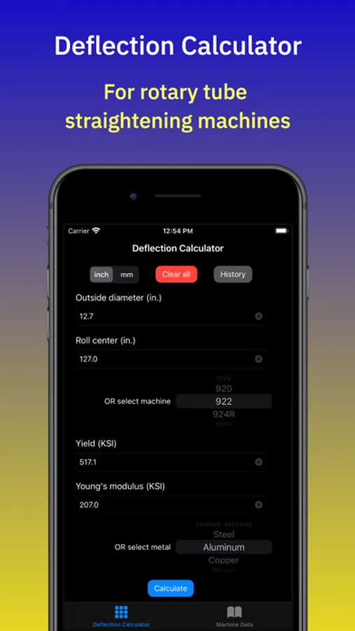 Deflection Calculator takes inputs for 4 parameters: outside diameter, roll center, yield, and Young's modulus. It outputs a deflection in inches or millimeters. A unit selector allows for easy transition between imperial and metric units. Past calculations can be viewed by pressing the History button.