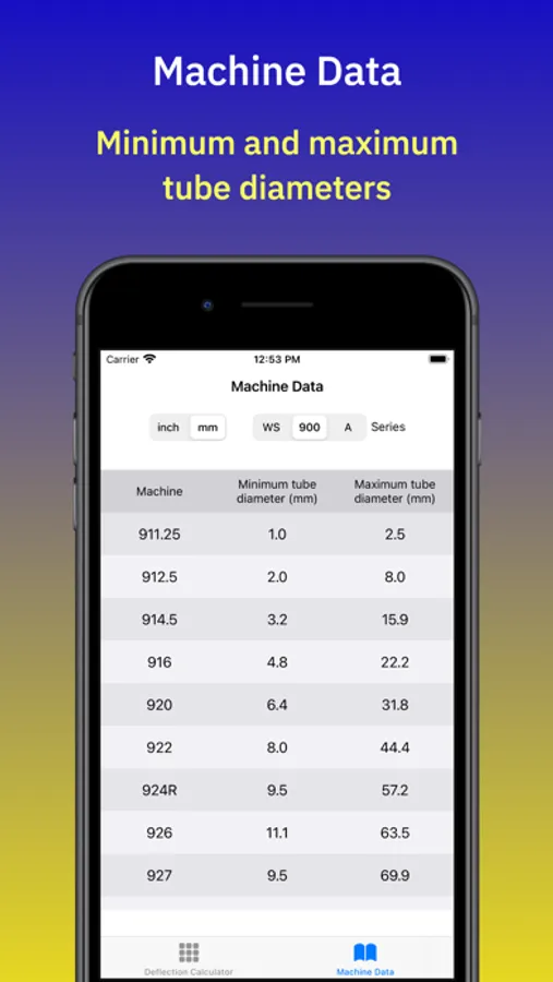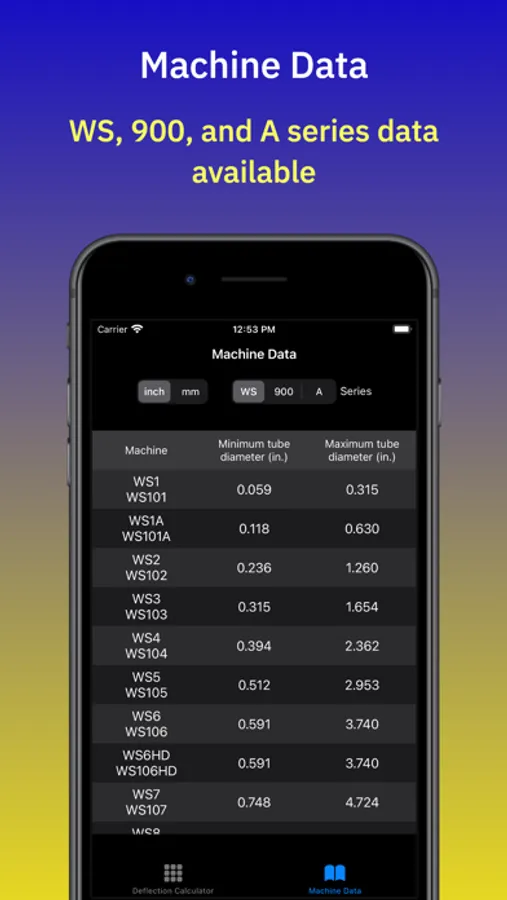 The Machine Data tab shows minimum and maximum tube diameters for machines in the WS, 900, and A series in imperial or metric units.