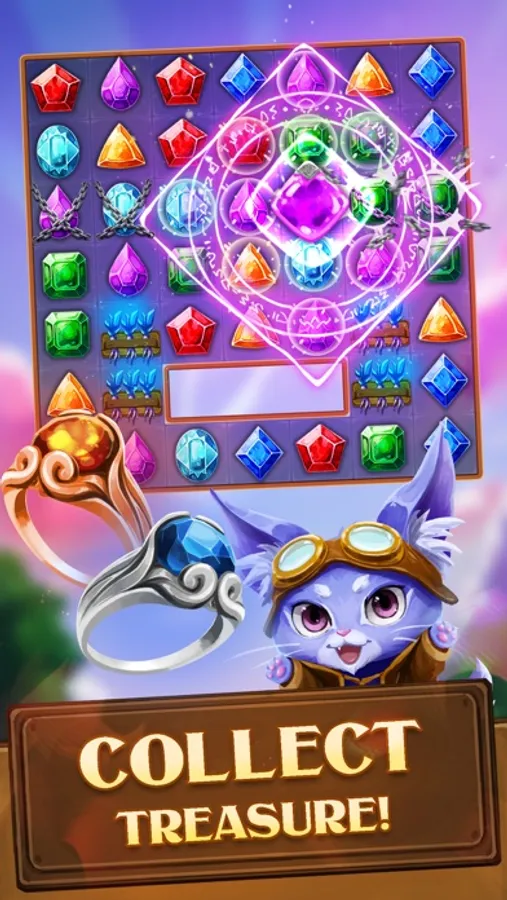 Have fun with Lucy, the purple cat, matching the gems!