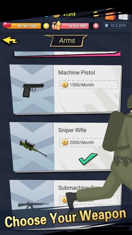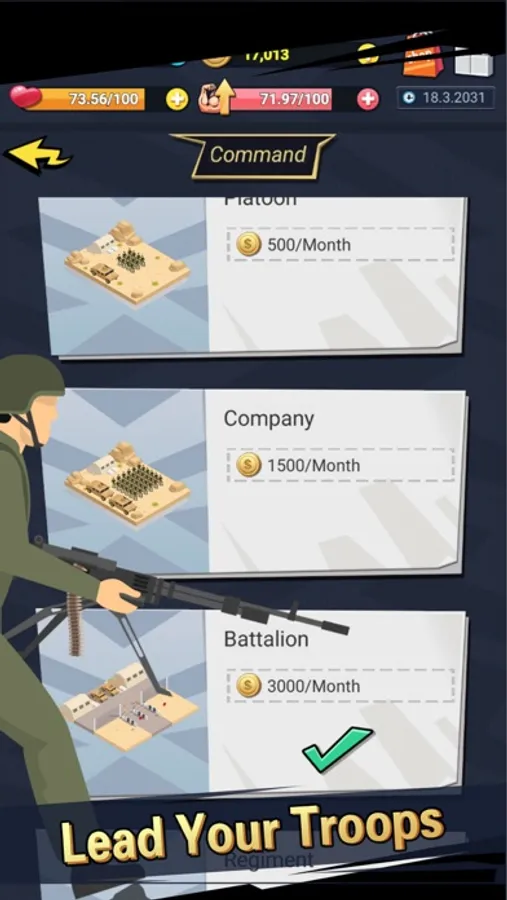It all started from the moment of you joining the army. Experience your way of promotion from an ordinary recruit to eventually becoming a five-star general.