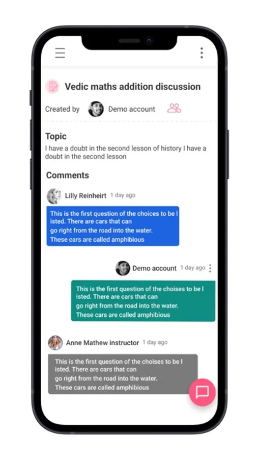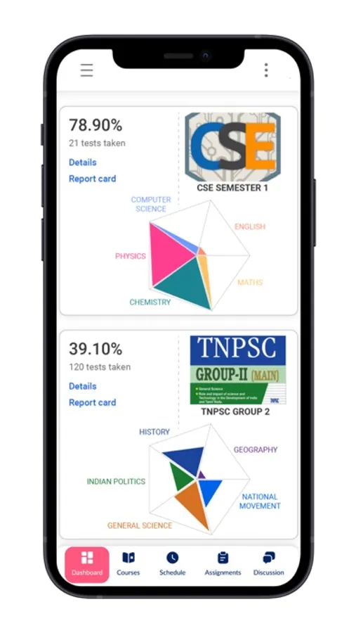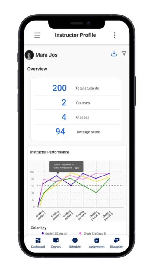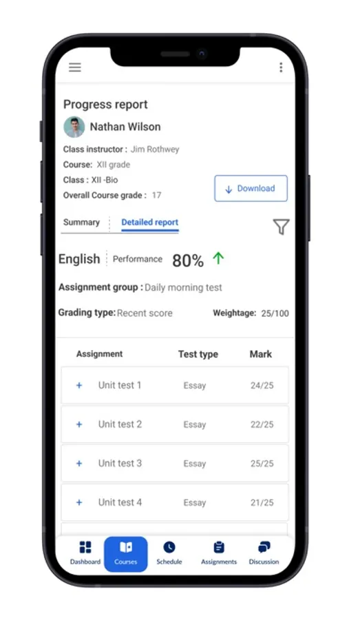 Students can participate in their classes by viewing course materials, completing assignments, checking the class schedule and taking tests. The dashboard shows the information regarding the students score, upcoming lessons and assignments that are due. The schedule page lets you view the class schedule, one on one classes assigned by the instructor. Notification messages provide gentle reminders when tests are due and classes begin so you don't miss an assignment or test. The discussion board allows students to interact with the instructor and fellow students in a safe and secure manner. Take the test and know the results right away or at a set time based on how they are set up.
