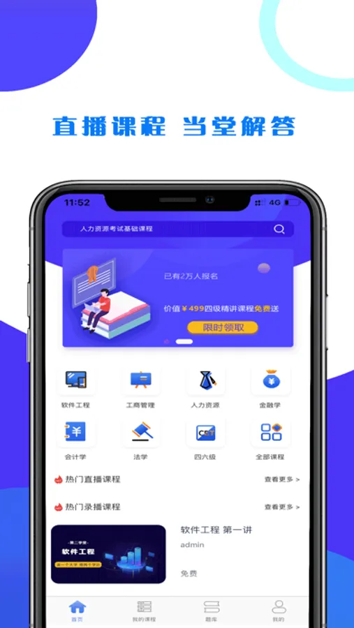 第二学位在线课程,在线直播+录播,全程名师授课,工商管理、人力资源管理、会计、法学、金融、软件工程、护理学等多个自考本科专业课程。在线免费题库,大学生学习助手。