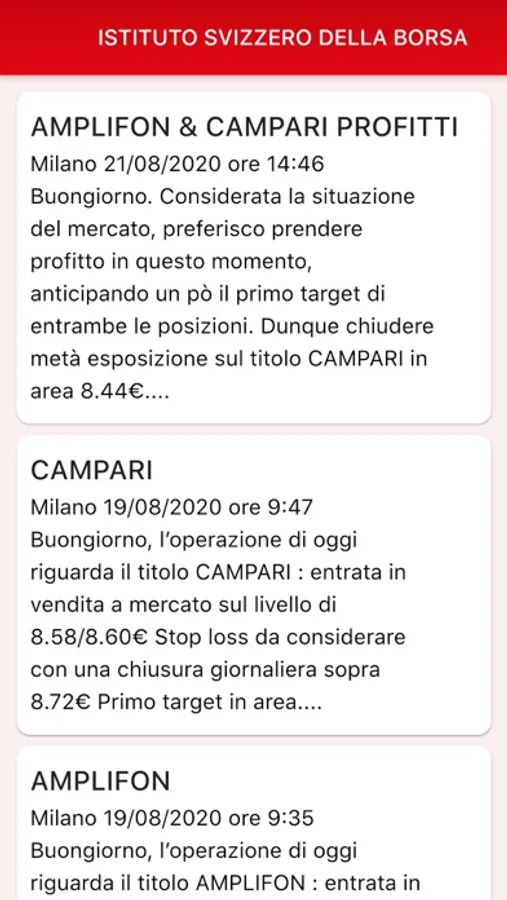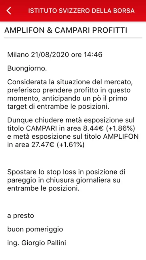 Segnali di Trading a cura dell’Istituto Svizzero della Borsa, propone su una APP proprietaria il grande successo ottenuto sul web dai propri servizi per i trader e gli investitori. Forex, azionario italiano, europeo e mondiale, ETF, opzioni, spread trading, future e CFD: l’approccio più semplice alla Cultura Finanziaria di altissimo livello, per seguire i migliori consigli e far crescere il tuo portafoglio imparando dal continuo confronto con grandi professionisti.