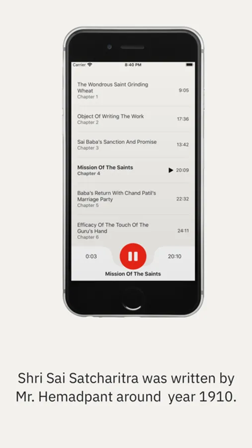This App in an Audio book narrating the Chapters of Shri Sai Satcharitra Book which consists of 50 chapters and narrates the stories of Shri Shirdi Sai Samarth / Sai Baba.