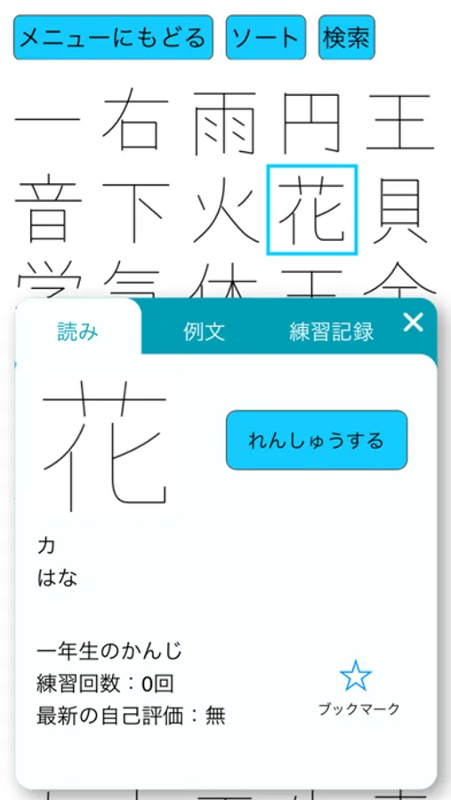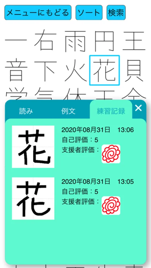 漢字毎に、練習した回数、自己評価(5段階)、指導者評価(5段階)を保存できます。