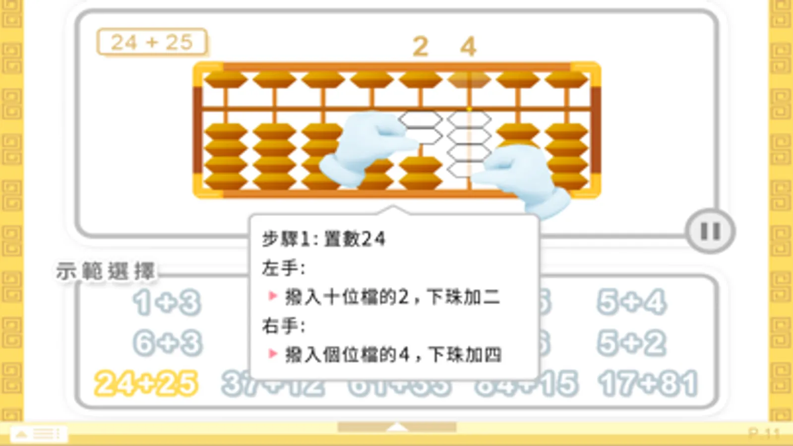 撥珠示範器讓我們輸入一個數字或一道算式,系統將會自動地在算盤上逐步進行撥珠及運算的示範並詳述說明,我們更可以隨時暫停當前步驟並仔細觀察說明, 或更換別的題目或數字進行新一輪的示範。