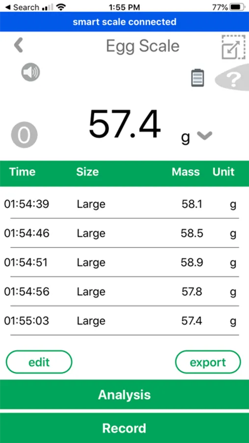 Selling eggs with correct weight classifications to maximize your profits. Having the eggs graded also means easier packing using the matching size egg cartons. Together the Super Egg Scale app and the Smart Chef Scale can help you instantly grade egg sizes from peewee to extra large. Also, the Egg Scale app logs all historical weight readings show you the statistical analysis (such as medium, average, maximum, and minimum weight reading of all your eggs.)