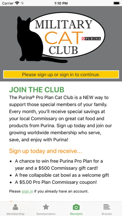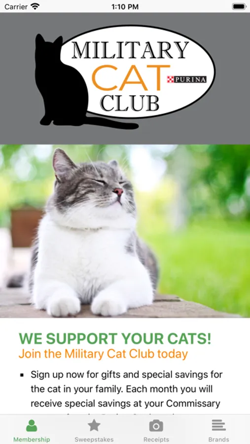 Sign up now for gifts and special savings for the cat in your family. Each month you will receive special savings at your Commissary on your favorite Purina Cat brands. Sign up now and receive a welcome gift, consisting of Cat bowls, a litter scoop and a $5 off Purina cat food coupon.