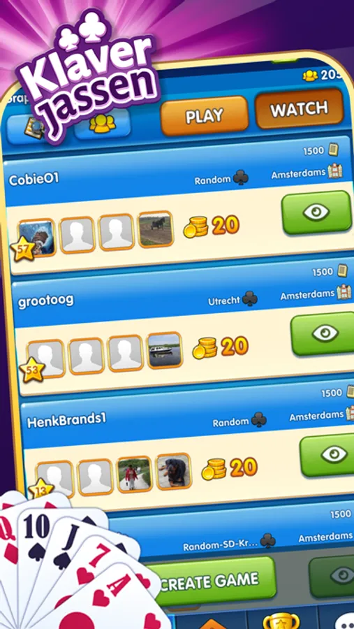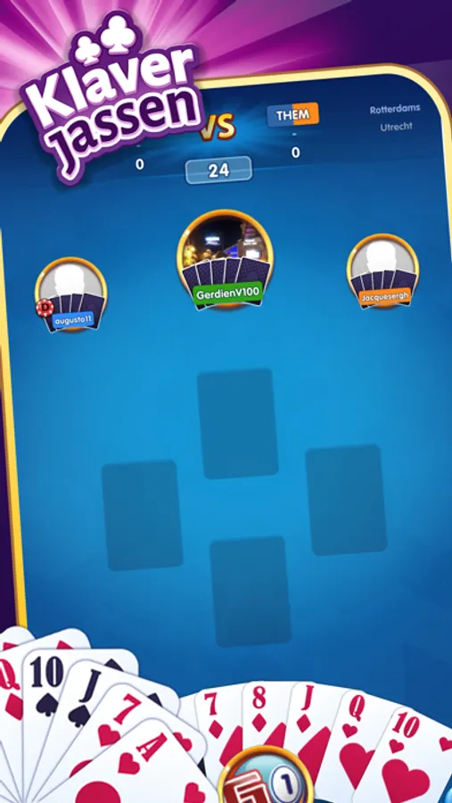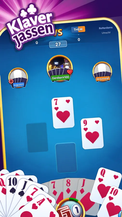 Download GamePoint Klaverjassen and enjoy a classic Dutch card game! GamePoint Klaverjassen is a free-to-play card game bringing all the best features from this Dutch classic game right to your mobile phone. Play against your friends, family or Klaverjassen players from all over the world anytime you want! Go head to head against your opponents and try to win a round and gain coins, experience, and achievements. Join the biggest Klaverjassen community and never get bored, you will always find people to play this classic card game with! GamePoint Klaverjassen is a game of skill and strategy, outsmart your opponent and become a champion of the best free card game! GamePoint Klaverjassen will give you the true authentic Dutch card game experience .GamePoint Klaverjassen is a 2v2 card game where the goal is to play the highest valued card each trick. Once every player has played a card, a new trick will begin. A single round consists of 8 tricks meaning every player always receives 8 cards at the start of the round.