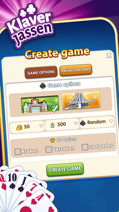 Choose from 2 exciting game modes! You can play with the Rotterdam or Amsterdam rules. In Rotterdam rules when a player cannot follow suit in a trick, they are obligated to play a trump card if possible. If they have a trump card that has a higher value than all the other cards currently played on the table, they must play the card.