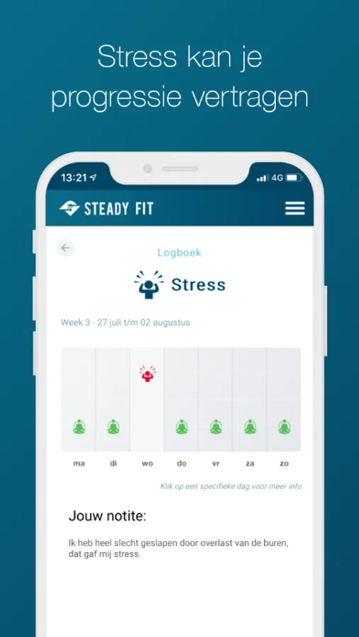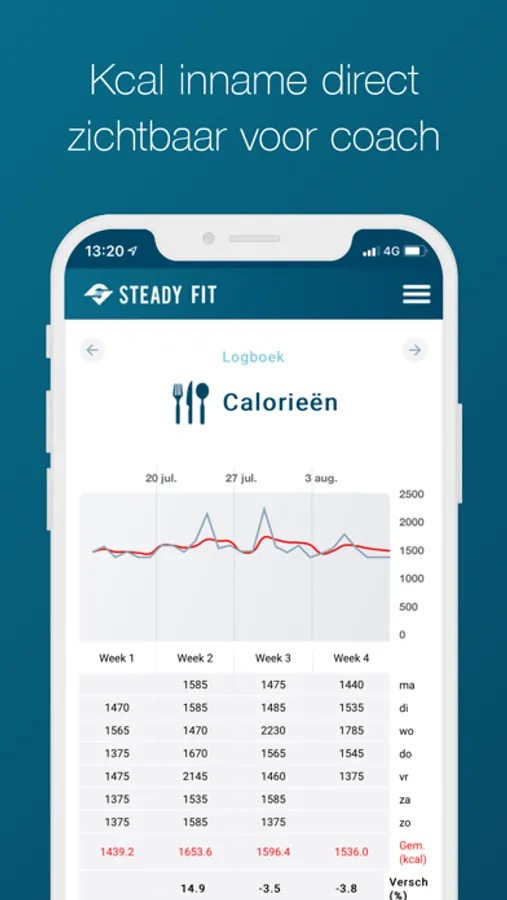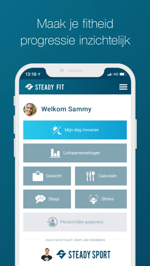 Of je nu zelf aan de slag gaat om fit te worden, of met één van onze personal trainers… met de Steady Fit app maak je jouw progressie digitaal inzichtelijk. Met de app hou je eenvoudig jouw persoonlijke logboek bij op het gebied van gewicht, calorieën, slaap en stress. Je hebt diverse duidelijke grafieken en tabellen tot je beschikking die jouw progressie weergeven op het gebied van training en voeding.