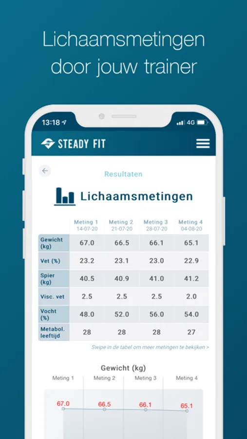 Jouw trainer voert regelmatig professionele lichaamssamenstelling metingen bij je uit welke worden ingevoerd in jouw app. Met de Steady Fit app weet je zeker dat je effectief en op maat gaat trainen. Samen met jouw trainer of coach behaal je maximaal resultaat!