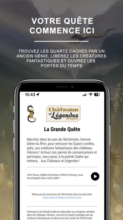 Aventuriers, aventurières ! John Howe, le célèbre illustrateur d’heroïc fantasy, vous attend pour partir dans une quête incroyable à travers les châteaux rhénans. Votre objectif : trouver les quartz cachés par un ancien génie, libérer les créatures fantastiques, et ouvrir les "Portes du Temps" !
