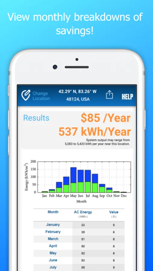 This app was expertly engineered by the National Renewable Energy Laboratory, the makers of PVWatts solar calculator, the unquestioned authority in computing annual solar production. It uses panel direction, panel tilt, latitude, local weather, and local electricity price to compute annual solar production in dollars.