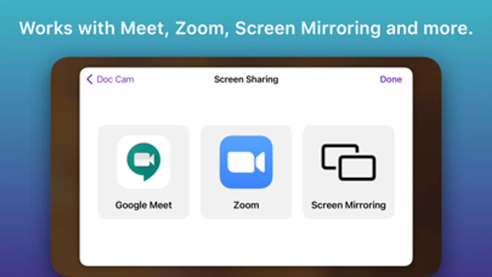 Doc Cam is a straightforward app for sharing your workspace with your students, just like a document camera or old school overhead projector. Doc Cam was designed with the needs of the remote learning classroom in mind. It’s compatible with Zoom, Google Meet, Microsoft Teams, and other services through screen mirroring, all with easy step-by-step guides for setup. For teachers who have already transitioned back to the classroom, you can still use Doc Cam with modern classrooms outfitted with computers or projectors compatible with AirPlay Screen Mirroring.