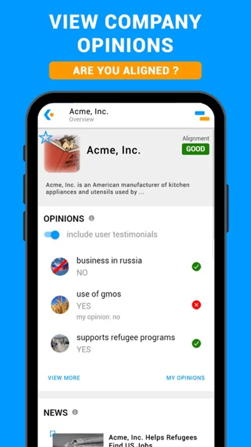 Companies know you well. They track your daily digital life, your habits, your opinions. With Alygne, discover companies' opinions on a variety of topics like abortion, deforestation, plastic use, … Search for companies in Alygne to get an instant alignment score and testimonials from other people.