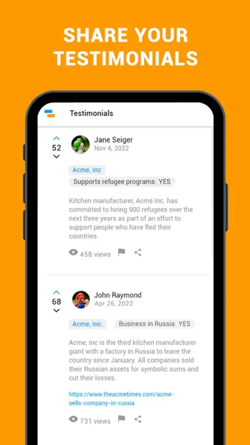 - Interact with other users by voting on testimonials that have been helpful for you.
