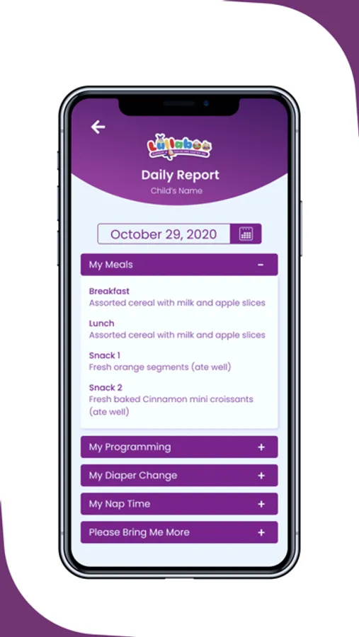 Reports are organized by section, making them clear and effortless to read. They include details regarding the child’s four daily meals and all beverages, nap time and related sleep comments, and diaper changes and washroom routines. Educators can also communicate item requests to parents as needed, which may include: diapers, wipes, or extra clothing. Daily programming is listed in detail, noting all the learning activities which a child participated in along with a description of the special interests they showed that day.