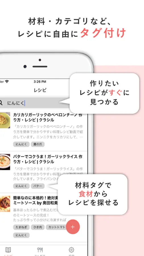 ・タグ付け機能で、レシピに材料をタグ付けして、材料から保存済みのレシピを検索