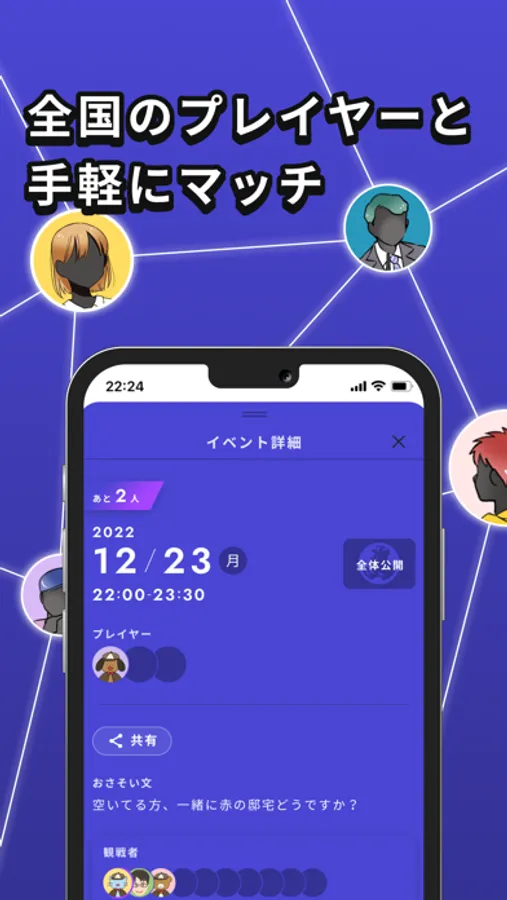マダミスに必要な機能は全て揃っているので、このアプリひとつで「遊びたいと思った瞬間」から「遊んで楽しかった」まで完結します!