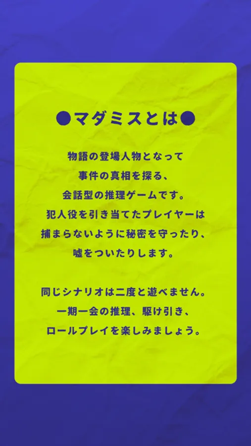 プレイヤーそれぞれの思惑が交錯するなか、事件の真相にたどり着けるのか、はたまた犯人として逃げ切れるのかといったドキドキする体験を楽しめるのがマダミスの醍醐味です。