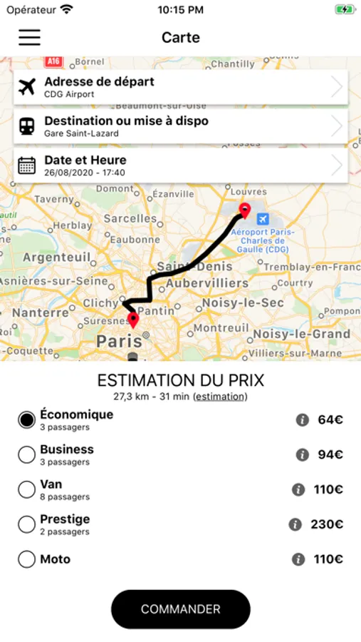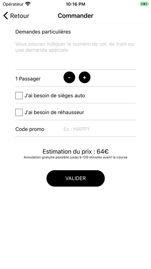 * Réservez votre courses en appuyant simplement sur un bouton -- possibilité de réserver votre VTC jusqu'à un an à l'avance et au plus tard une demi-heure avant votre prise en charge par le chauffeur.