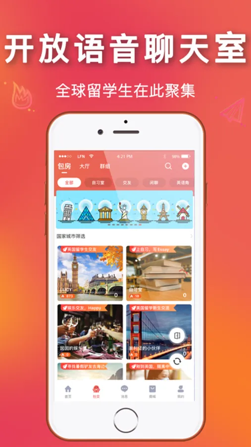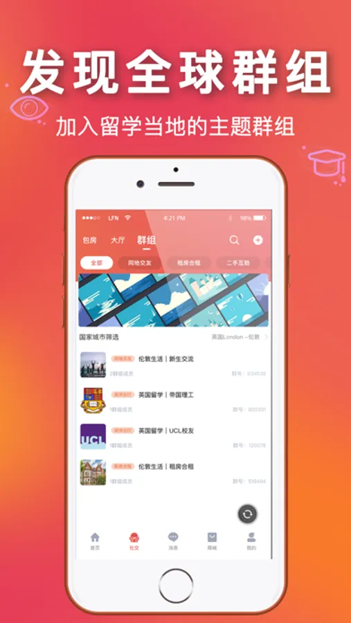 根据留学生的全球分布情况和留学生活热门话题,设计带有地区筛选与兴趣标签的资讯、语音聊天室、群组!