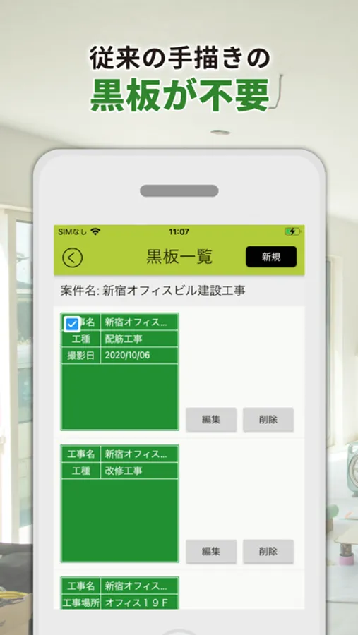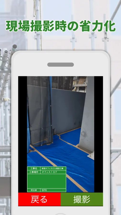 写真整理が不要な電子小黒板アプリです。建設現場、建築現場で現場写真を取る際に、黒板入り写真をスマホで撮影することができます。黒板の文字はパソコンやスマホから作成でき、リストから選ぶだけで撮影できます。SITE(Web)と連携することで、工事写真は自動整理されるため、写真整理が不要になります。
