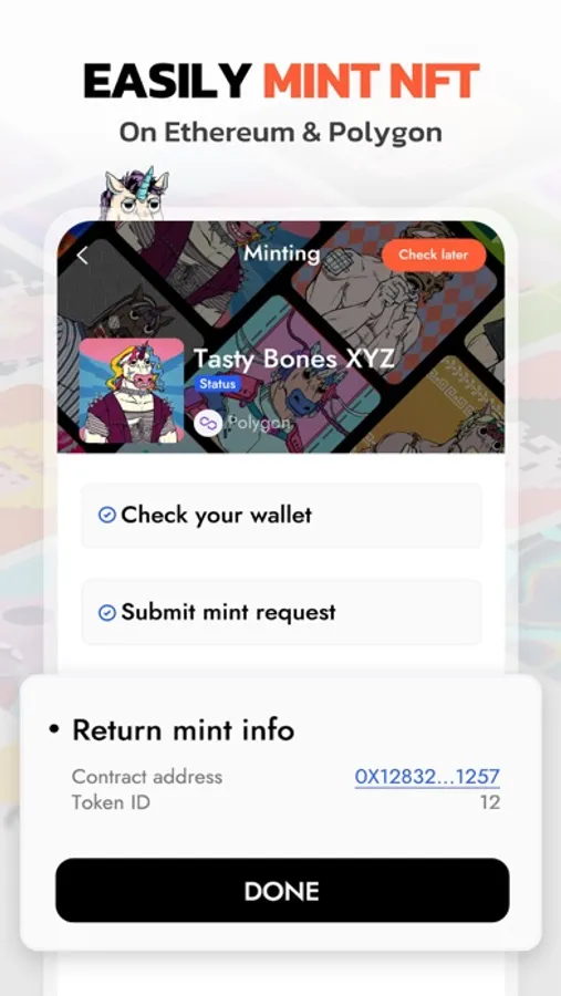 You can mint your own NFT on Ethereum/Polygon. Open source protocol is provided for you to verify minting and view NFTs' info on the blockchain.