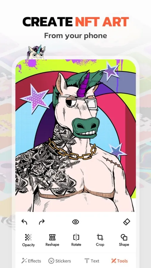 Add crypto art graphics to pictures to turn up the metaverse level on your edits and create your NFT artwork.