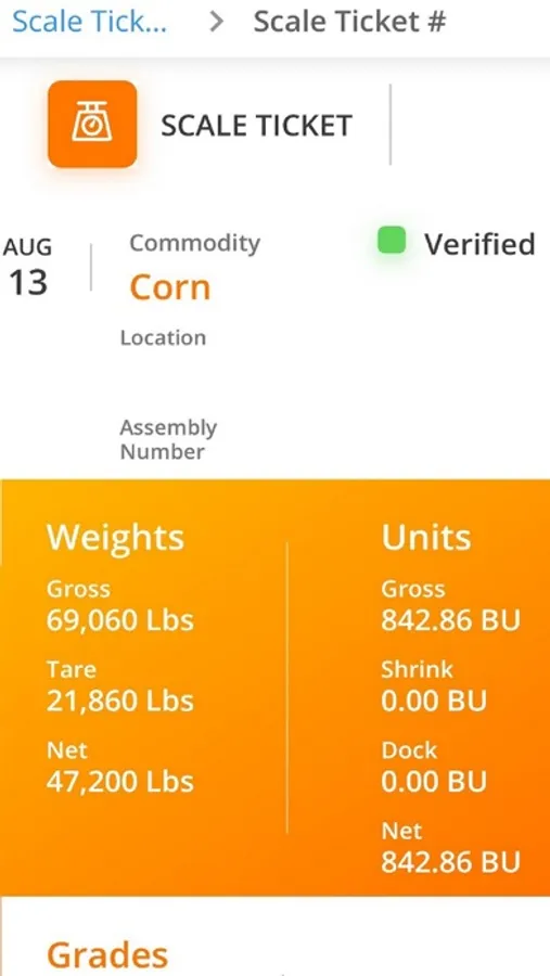 • Click on a scale ticket to view more details, commodity, weights, units, grades, splits.