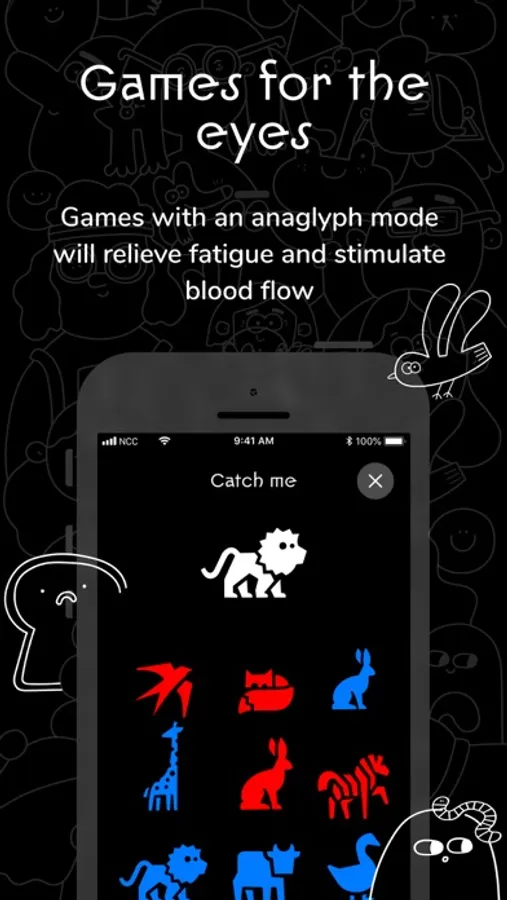 Simple games consisting of finding shapes on a contrasting or dynamic background allow you to constantly keep your eye muscles in shape and are good for relaxing after a long hours in front of computer. For greater efficiency, we recommend using anaglyphic glasses — any 3D glasses with red and blue glass are suitable.