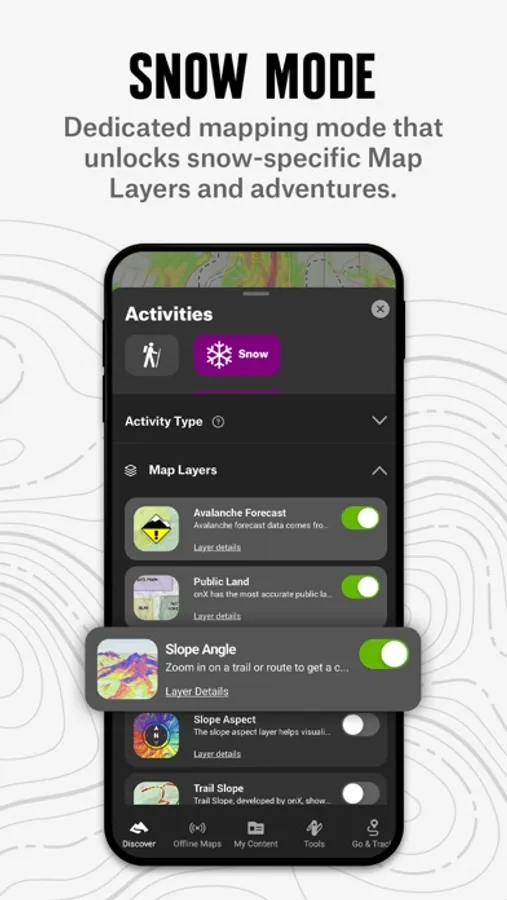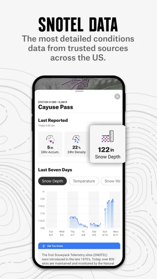We adventure in three dimensions, your planning should reflect that. With a 3D map you can visualize terrain, scout lines, and plan for hazards before you hit the trail. See recent conditions with reports from other trail users, and get winter snowpack info from SNOTEL stations and regional avalanche forecasts right in the app. Build custom routes seamlessly with snap-to-trail functionality, and drop Waypoints to leave notes on key points. Use Slope Angle, Slope Aspect, Trail Slope, and Wildfire Layers to plan in more granular detail.