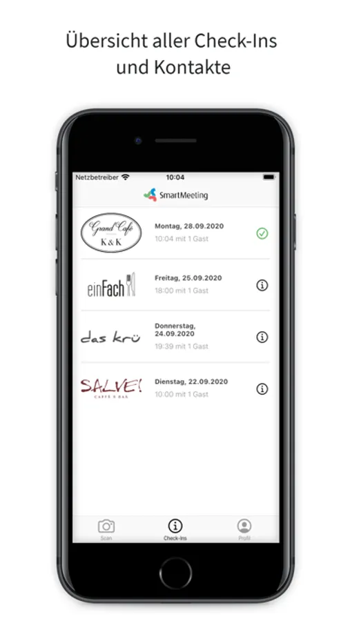 Im SmartMeeting Kontaktbuch können Sie anschließend schnell und chronologisch Ihre Kontakte in Restaurants, Vereinen und Unternehmen sowie alle persönlichen Treffen nachvollziehen.