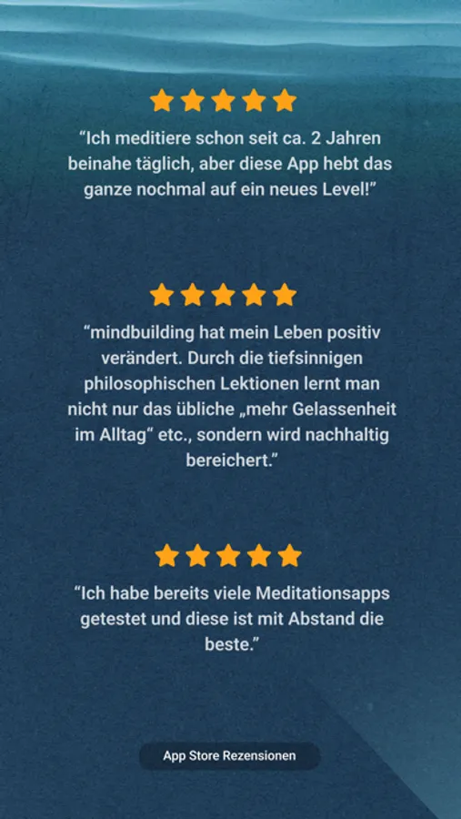 "mindbuilding hat mein Leben und meine Wahrnehmung positiv verändert. Es hebt sich von allen anderen Meditationsapps durch die tiefsinnigen philosophischen Lektionen ab, wodurch man nicht nur das übliche „mehr Gelassenheit im Alltag“ etc. vermittelt bekommt, sondern nachhaltig bereichert wird."