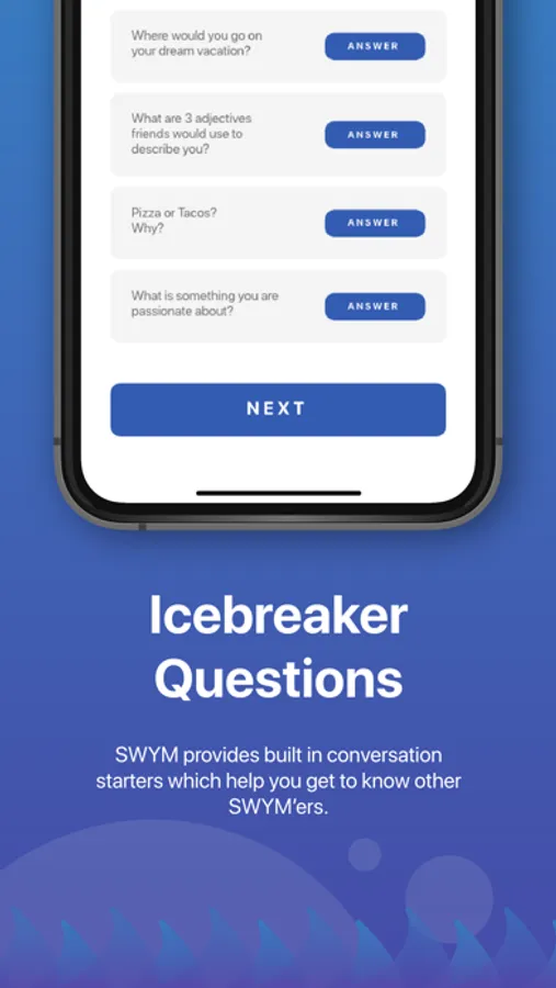 SWYM is a dating app that allows users to meet at widely attended events or spaces ranging from concerts, festivals, conferences, parties, game nights, sporting events, etc. to gatherings at outdoor spaces, bookstores, you name it! With SWYM app you can join (or launch your own) pool and once it’s active you can connect with other mutually interested users attending the same event! Our Icebreaker questions allow you to learn more about others in your pool and have some conversation starters to spark conversation after you connect.
