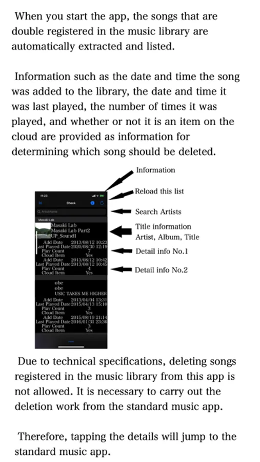 This app provides a criterion for deleting one of the songs (albums) registered from a physical CD and the songs (albums) acquired from the network by subscribing contract, if one is double-registered. It will be a tool for this purpose.