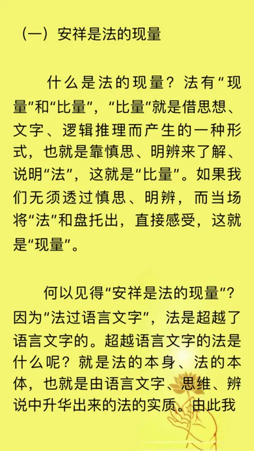 安祥禅的命名,是以“心安则吉祥”立名为“安祥”,并将“释尊拈花,迦叶微笑”迄中华祖师禅一脉相传的内涵——“安祥”直接外举,故再定名为“安祥禅”。