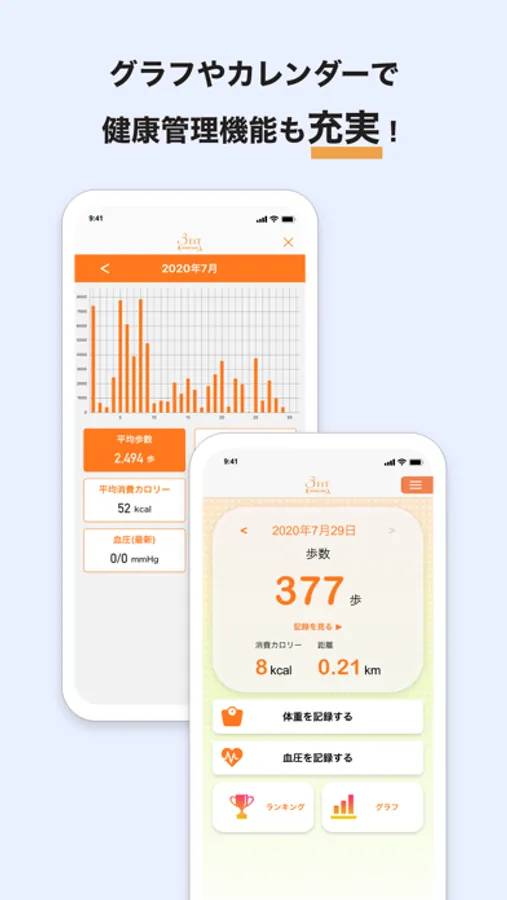毎月の歩数や消費カロリーなどの推移やランキングをチェックできます。
