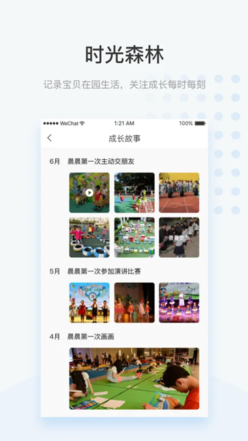 时光森林:云端记录宝贝在园的学习、生活、成长、体育活动,数据永不丢失。