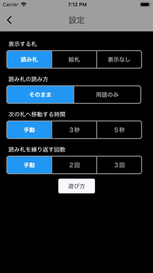 読み上げの回数(1回~3回)や次の札に移る時間(手動、3秒、5秒)の設定も可能です。