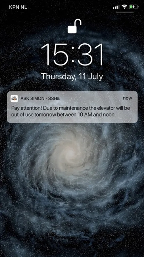 Simon will send you push notifications when important maintenance work is scheduled. This way you are quickly informed when SSH& is making improvements to your housing complex.