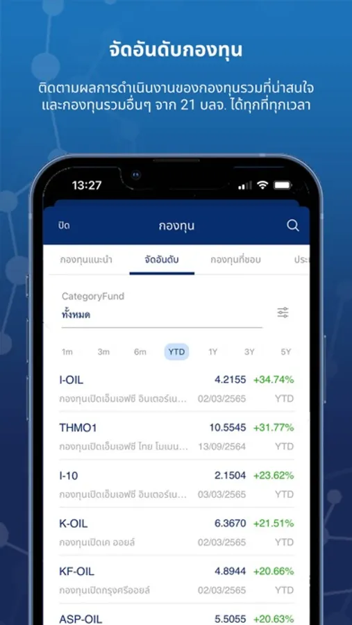 • Fund Ranking: จัดอันดับกองทุน จัดอันดับผลการดำเนินงานของกองทุนรวมจาก 21 บลจ. และติดตามกองทุนที่ท่านชื่นชอบ ได้ทุกที่ทุกเวลา