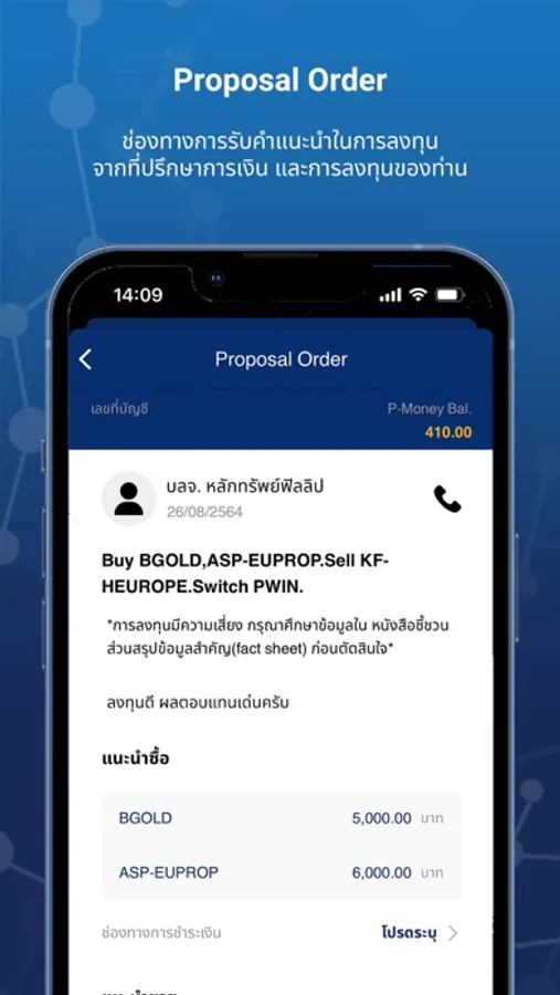 • Proposal Order: ไม่พลาดทุกคำแนะนำ ดูแลอย่างใกล้ชิด กับช่องทางการรับคำแนะนำในการลงทุนจากที่ปรึกษาการเงินและการลงทุนของท่าน