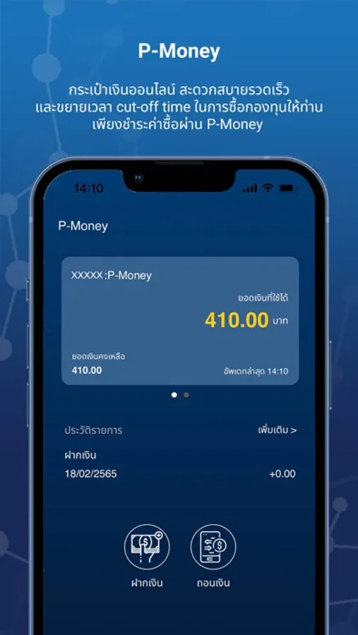 • P-Money: กระเป๋าเงินออนไลน์ สะดวกสบายรวดเร็ว และ ขยายเวลา cut-off time ในการซื้อกองทุนให้ท่าน เพียงชำระค่าซื้อผ่าน P-Money