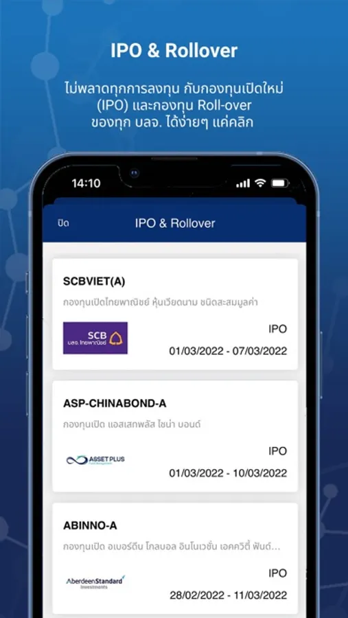 • IPO & Rollover: ไม่พลาดทุกการลงทุน กับกองทุนเปิดใหม่ (IPO) และ กองทุน Roll-over ของทุกบลจ. ลงทุนได้ง่ายๆแค่คลิก