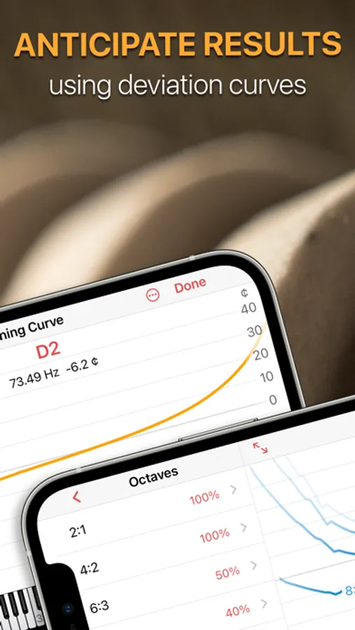 - Detailed deviation curves: Graphical representation of the deviation of fourths, fifths, octaves, twelves, double octaves, nineteenths and triple octaves