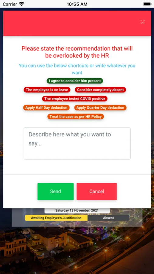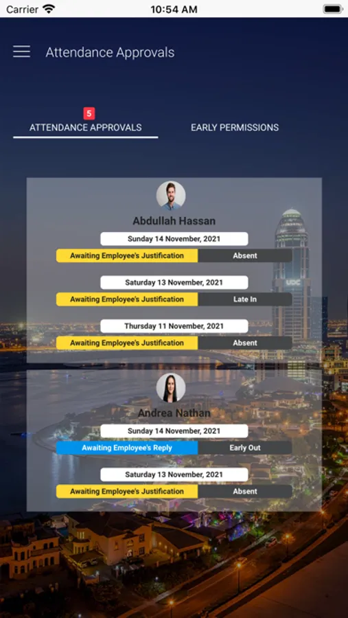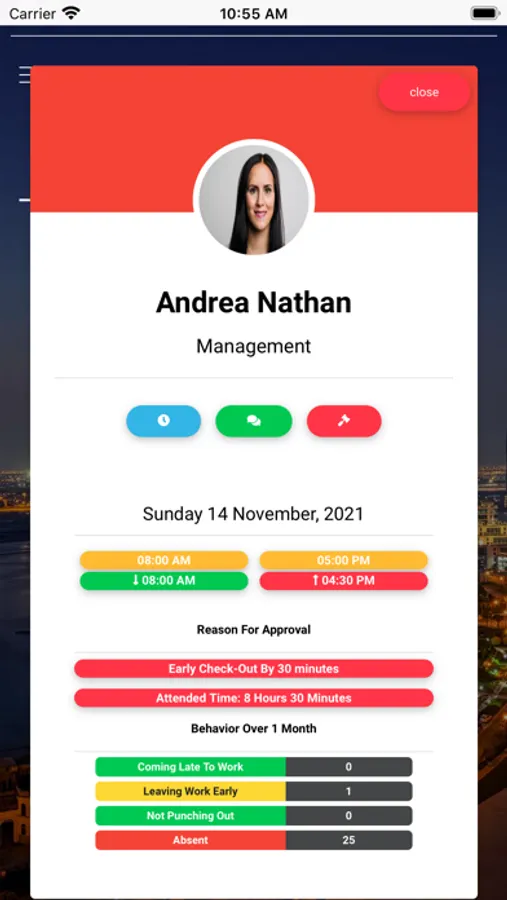 Approvals are also available through the app, by which the direct manager can approve or reject an attendance. These approvals are determined by the system based on the Shift-Start time of each employee, working hours, missed check-out, etc...