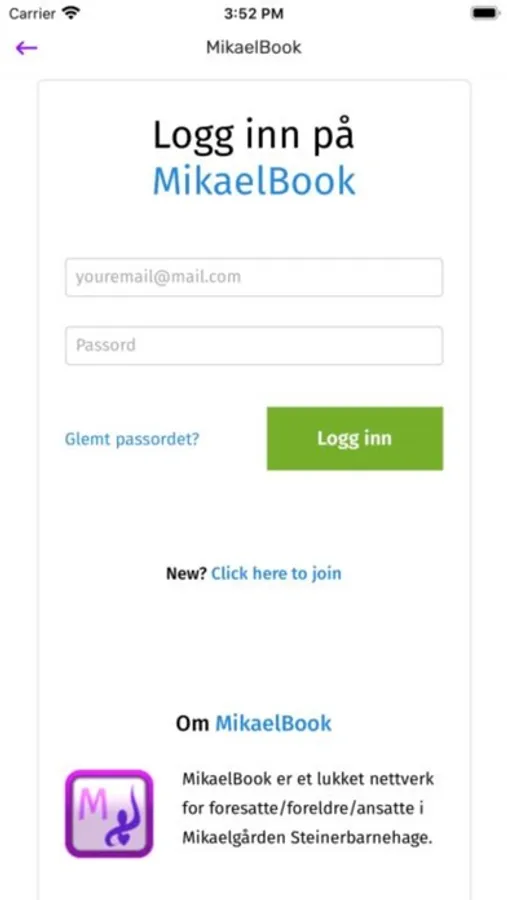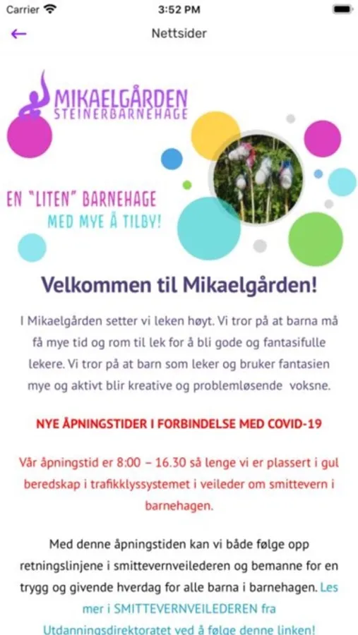 Denne appen er ment for foreldre/foresatte og ansatte i Mikaelgården Steinerbarnehage på Bøler, men kan også brukes av andre som ønsker informasjon om barnehagen.